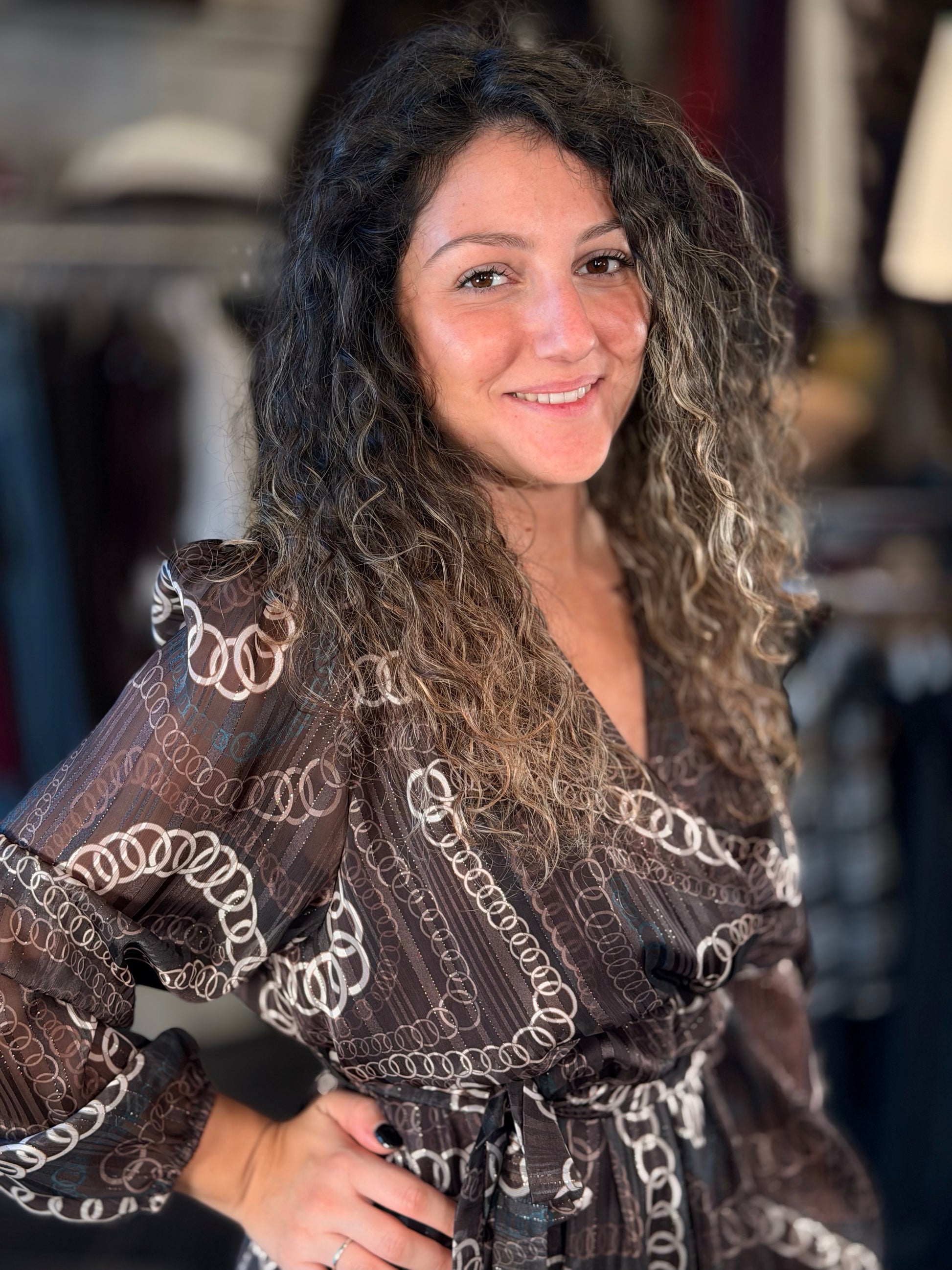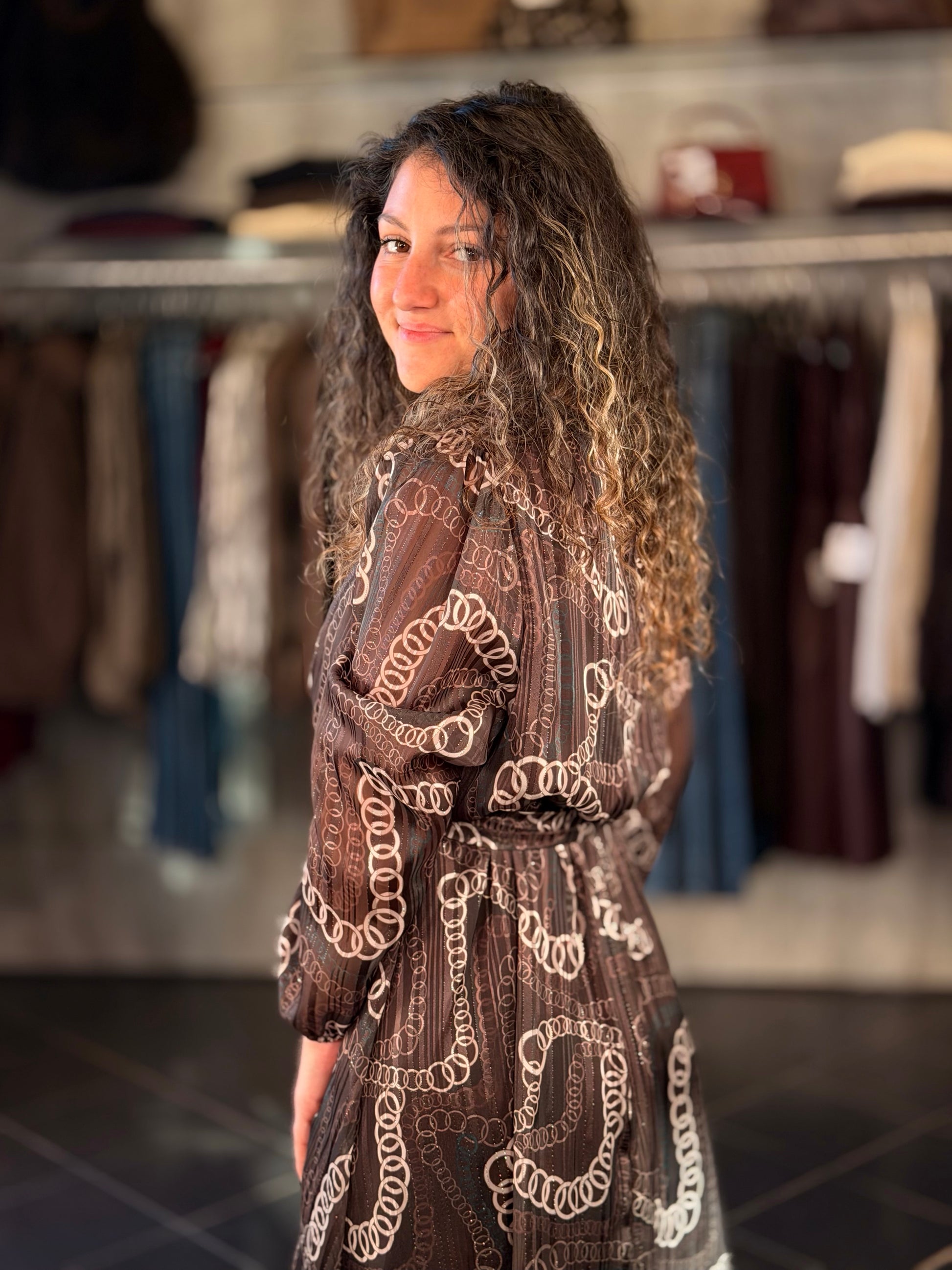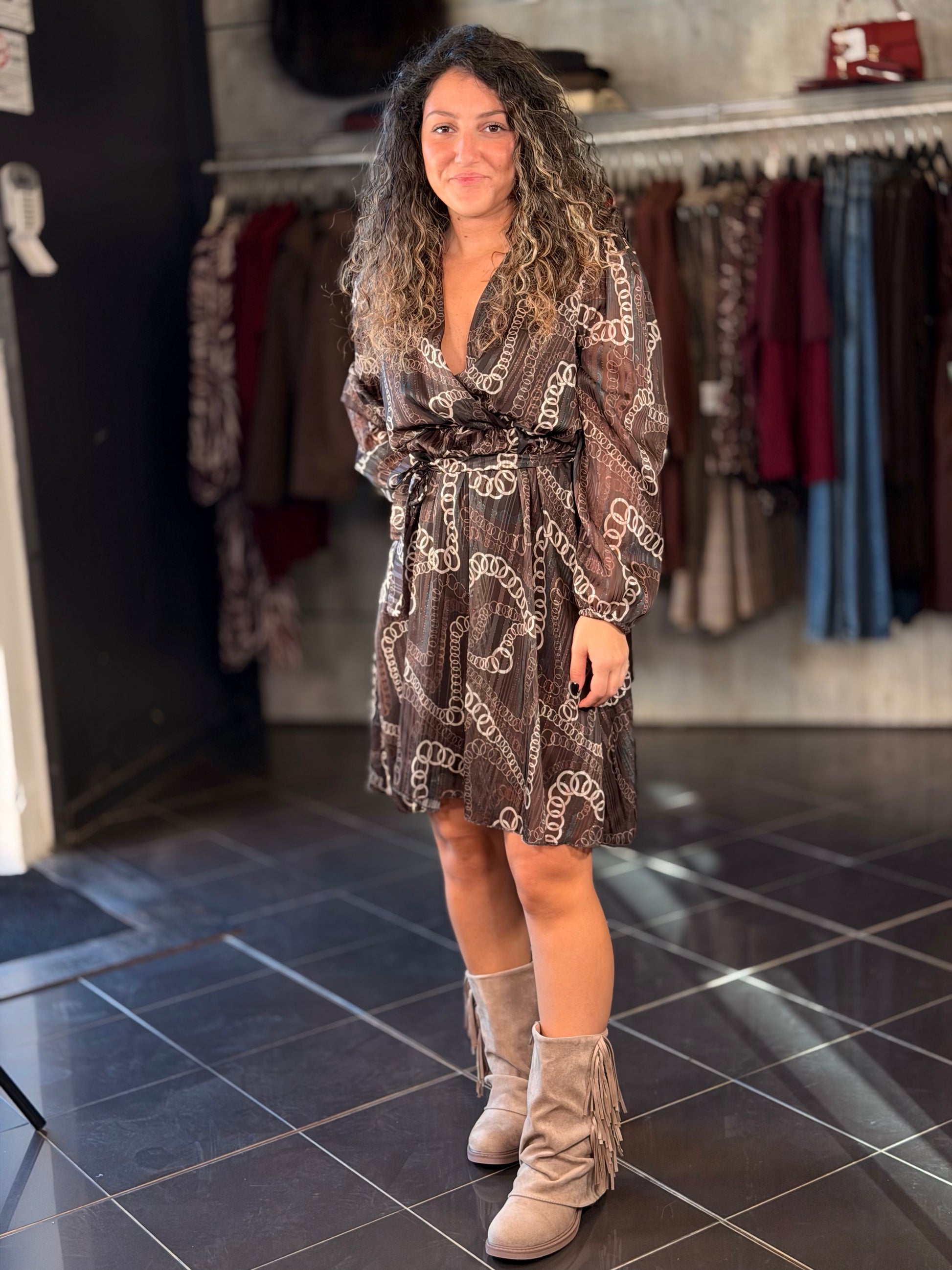 Abito marrone scollo a v e fusciacca con fantasia in taglia unica 2435