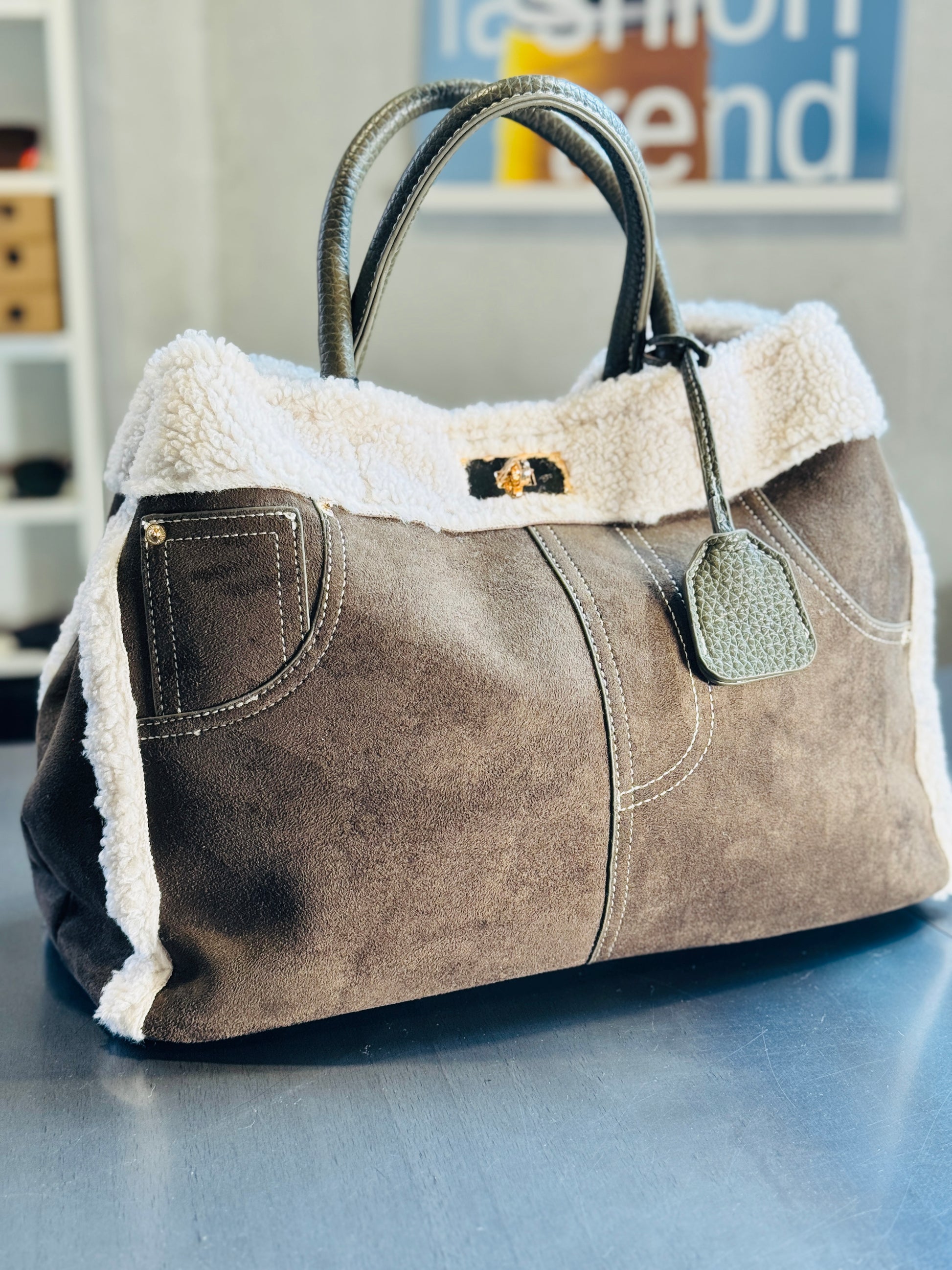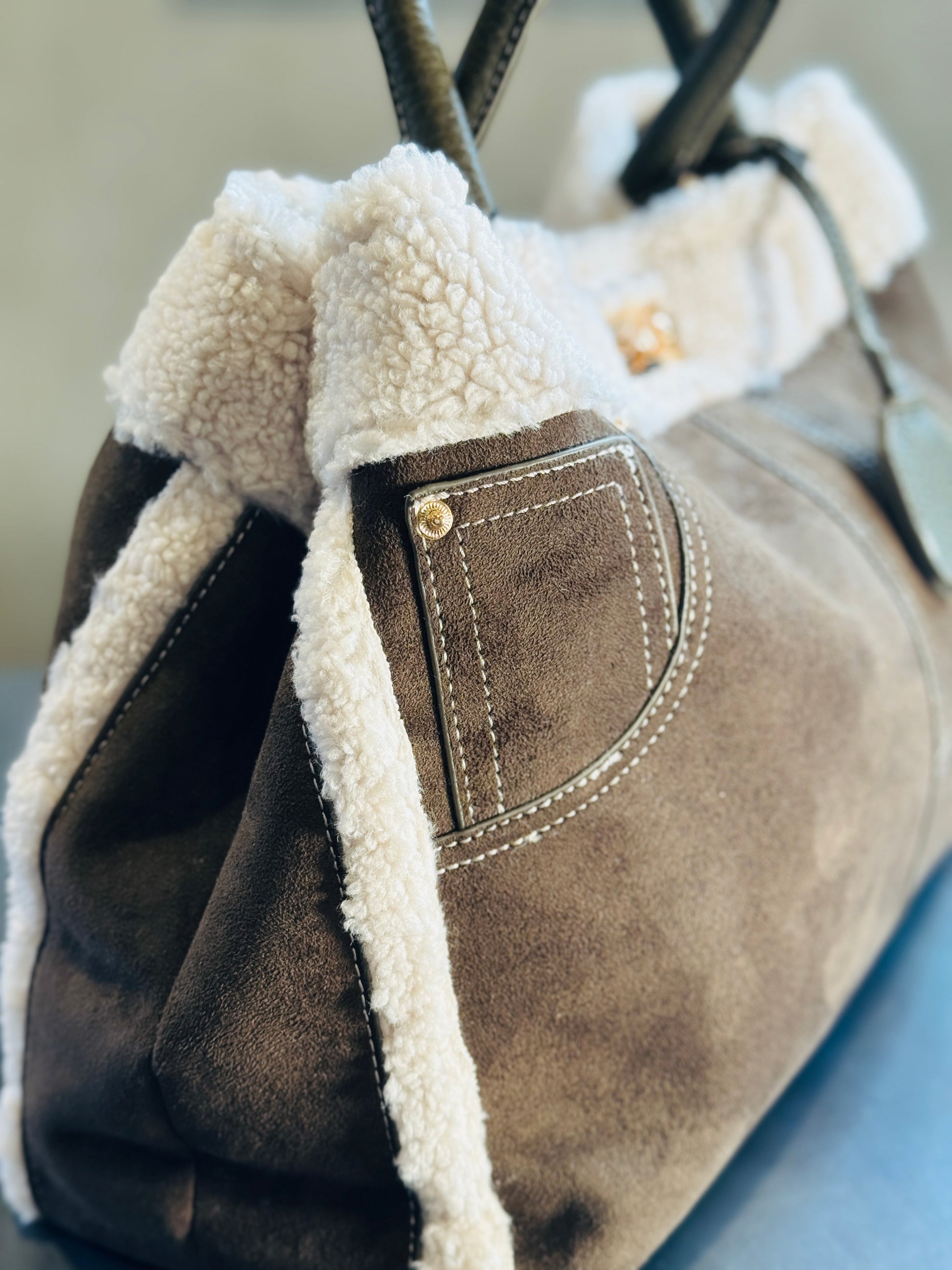 Borsa effetto camoscio verde militare e inserti in effetto montone con tracolla all’interno 2077