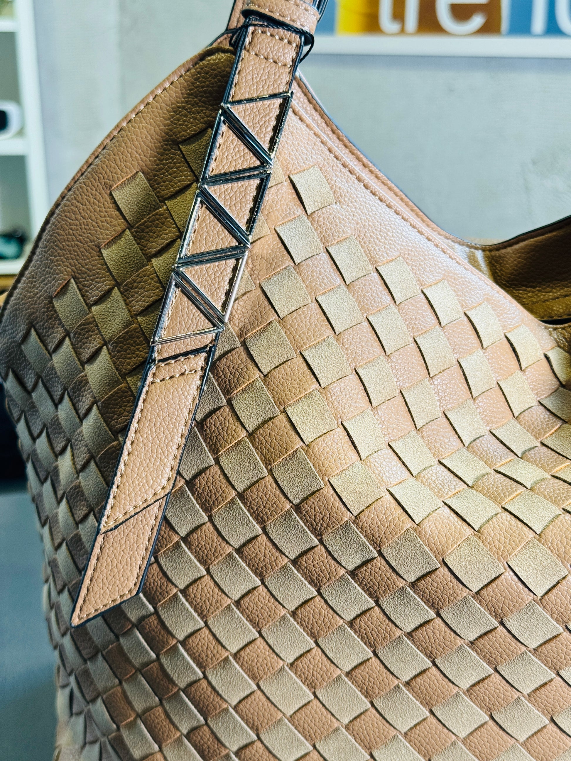 Borsa in similpelle a spalla intrecciata beige con tracolla all’interno 2390