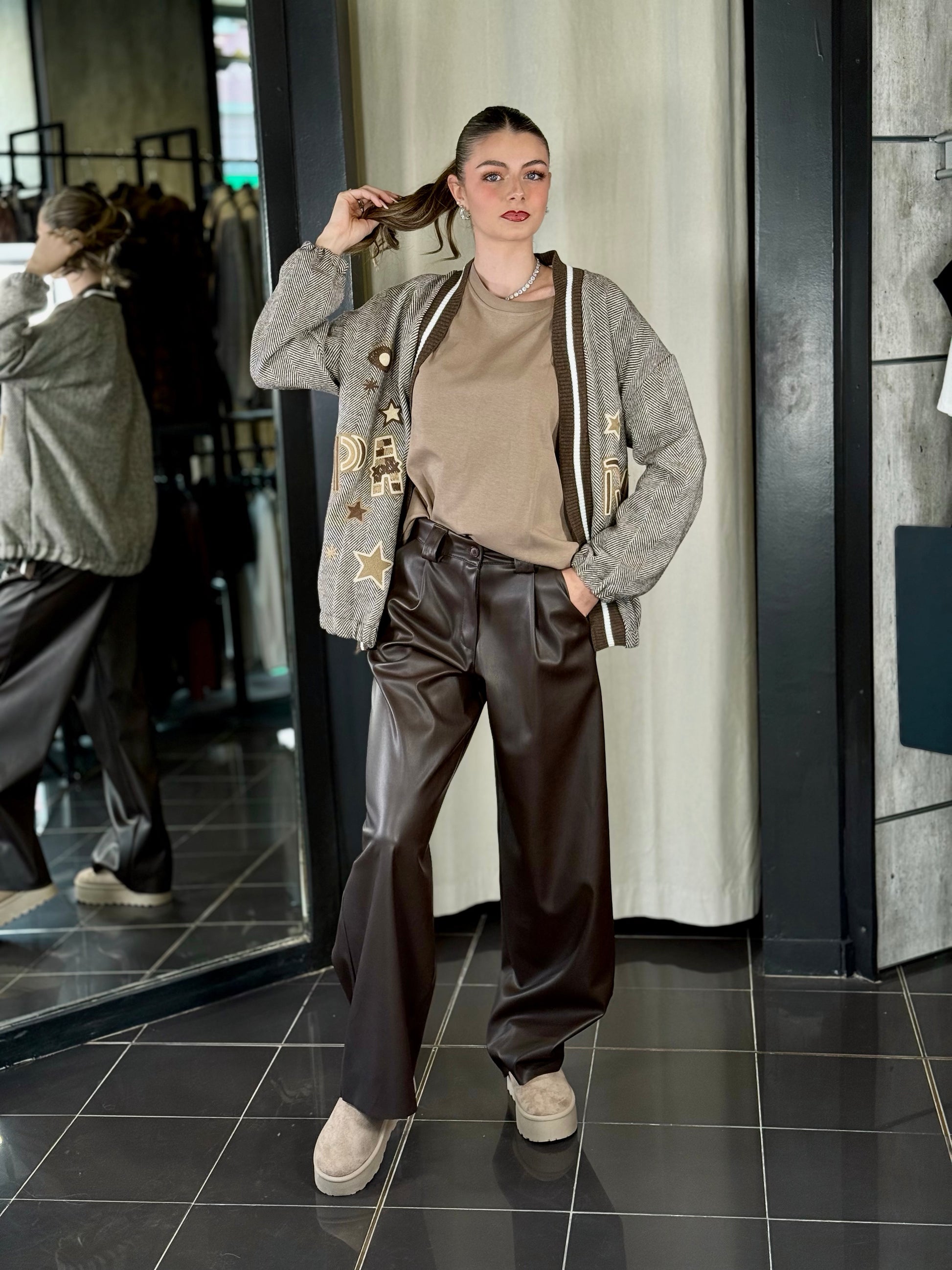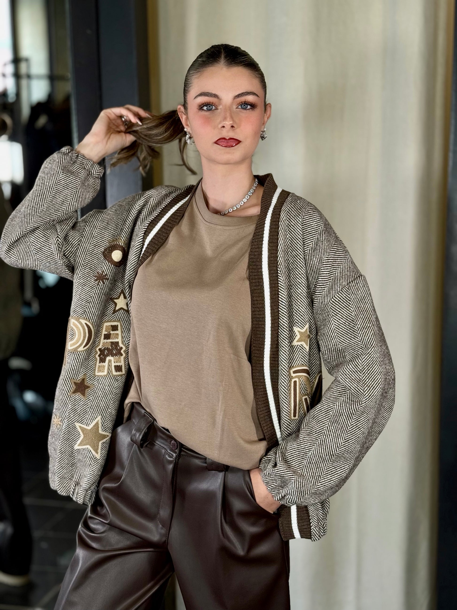 Cardigan spigato marrone con patch in taglia unica 2257
