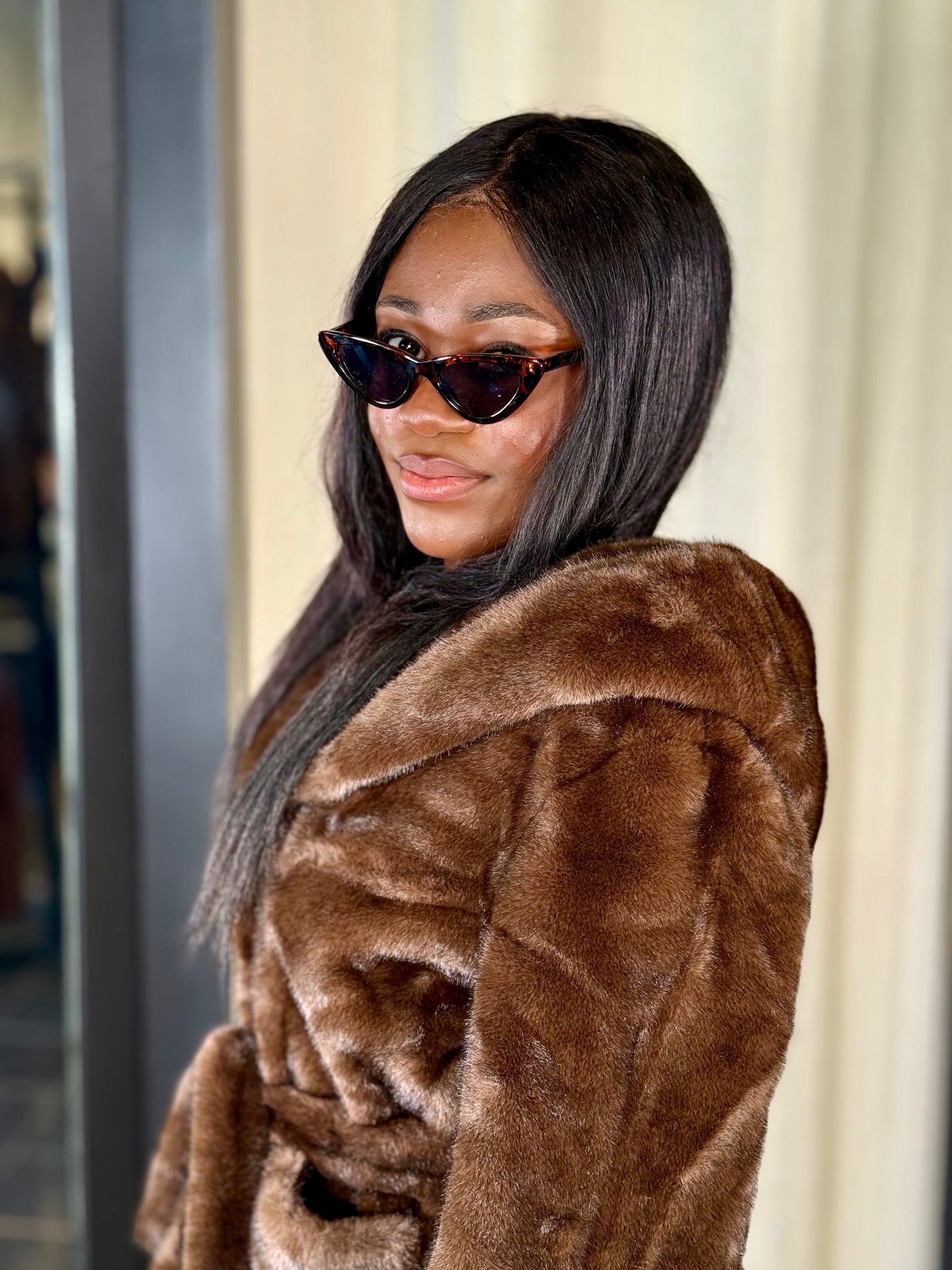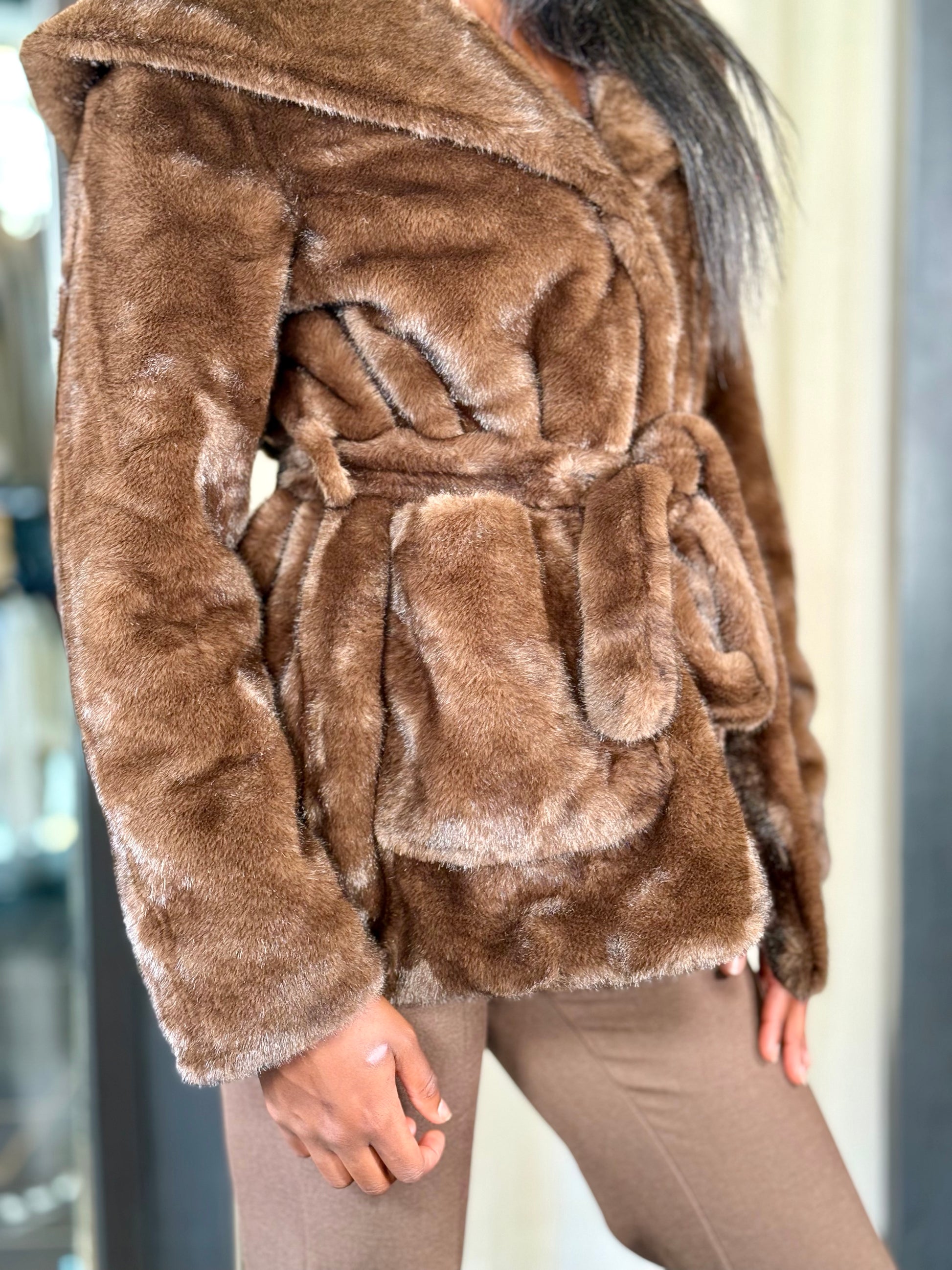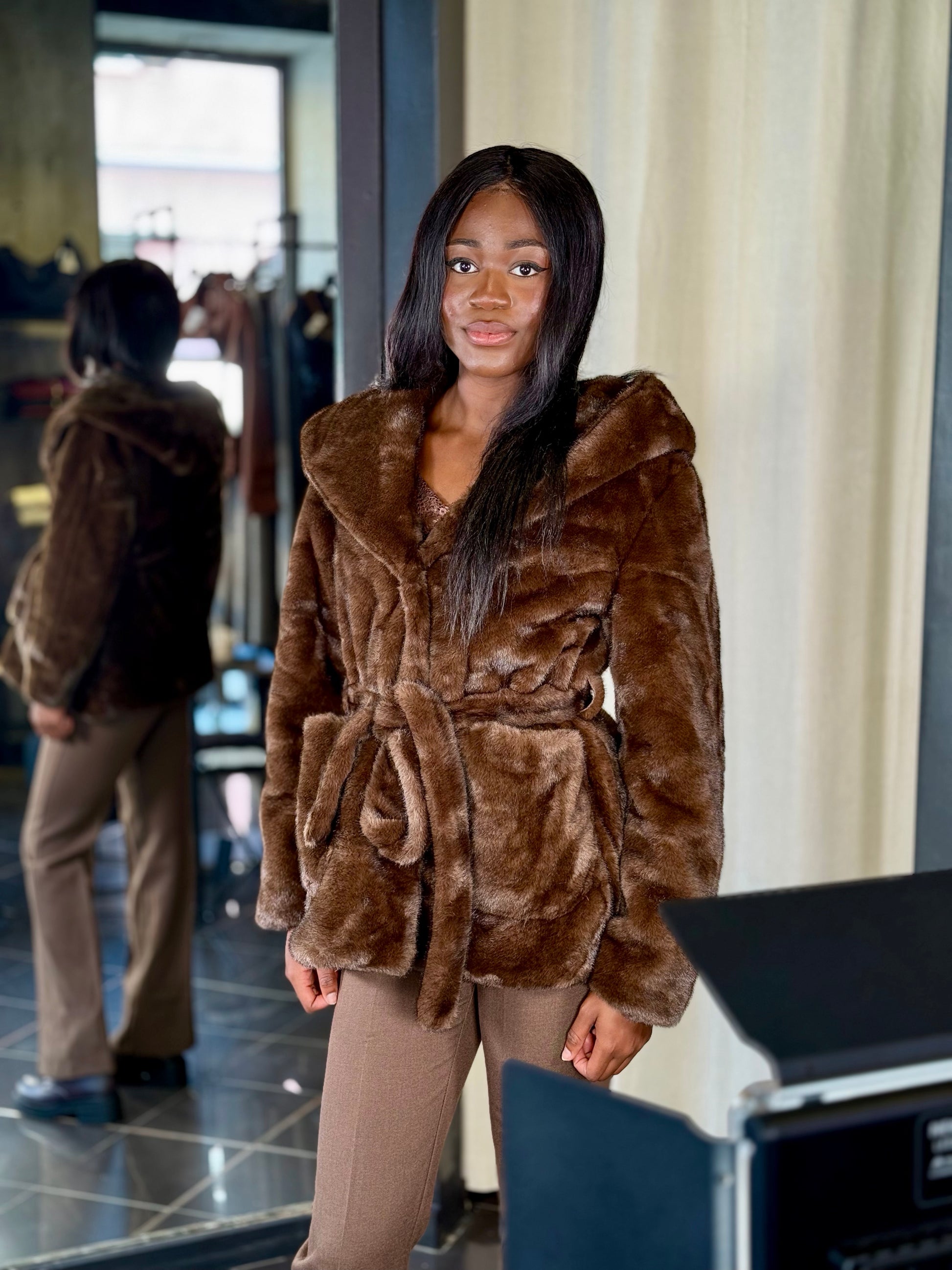 Eco pelliccia marrone con cappuccio e fusciacca in taglia unica 2175
