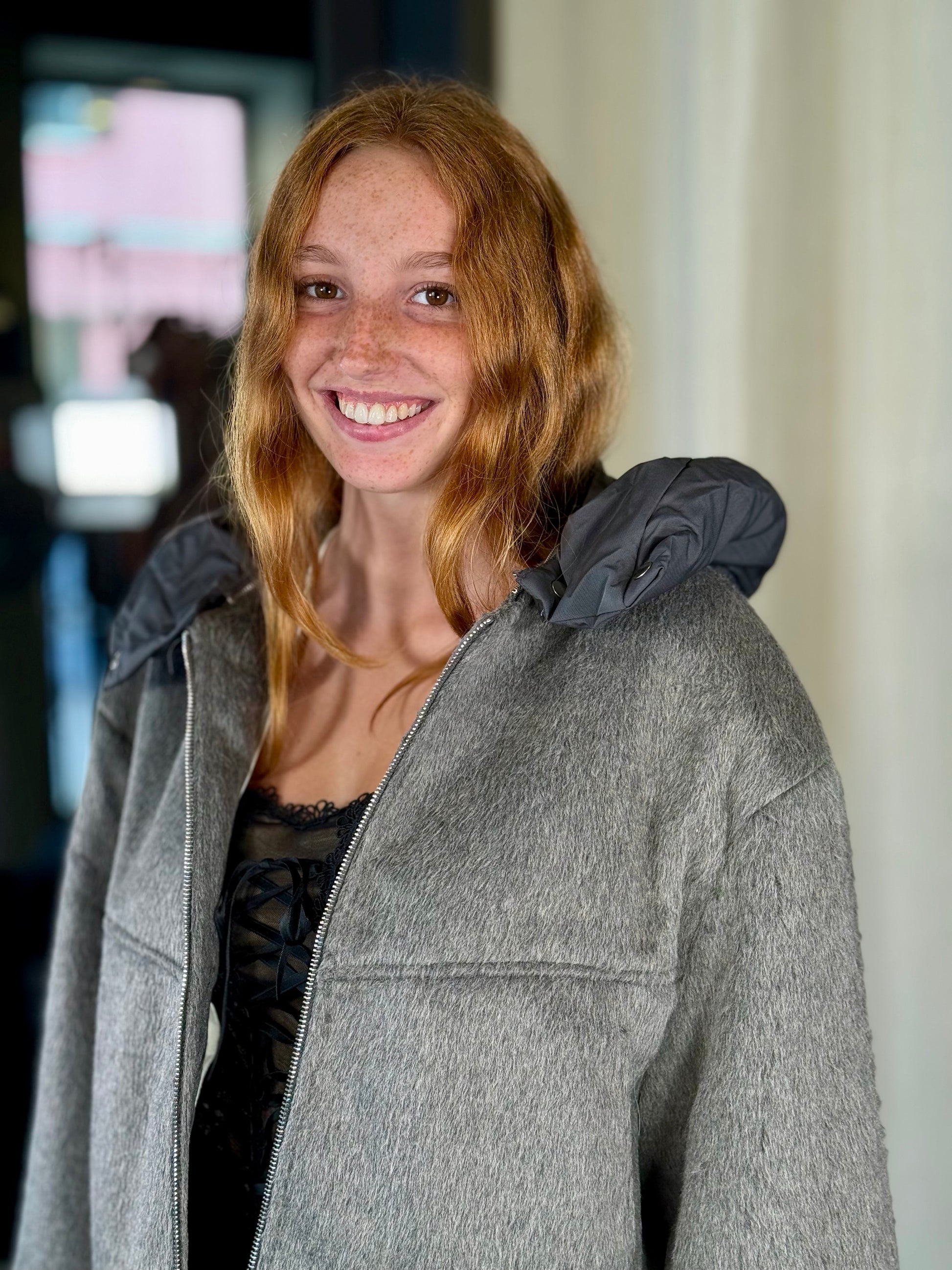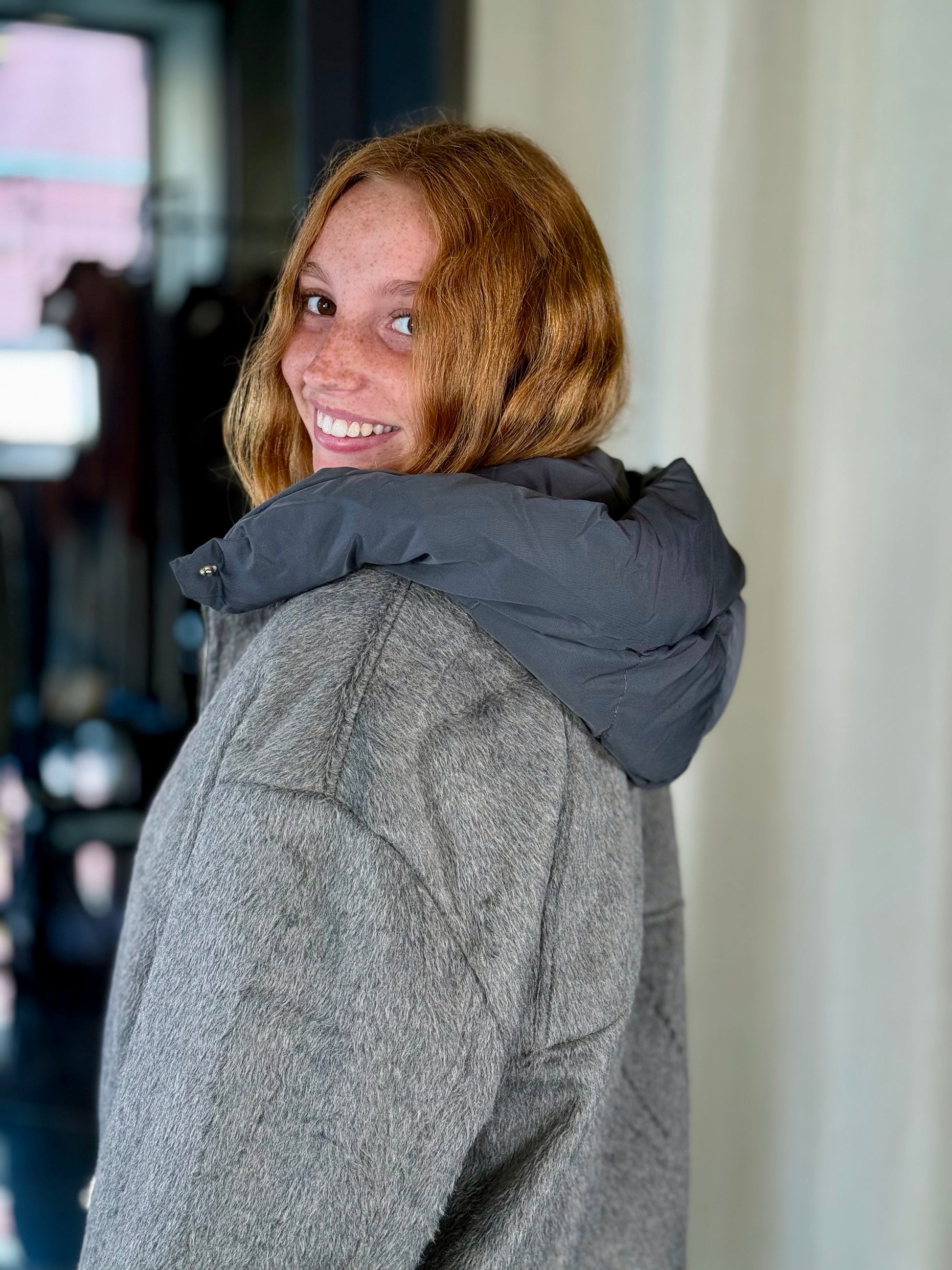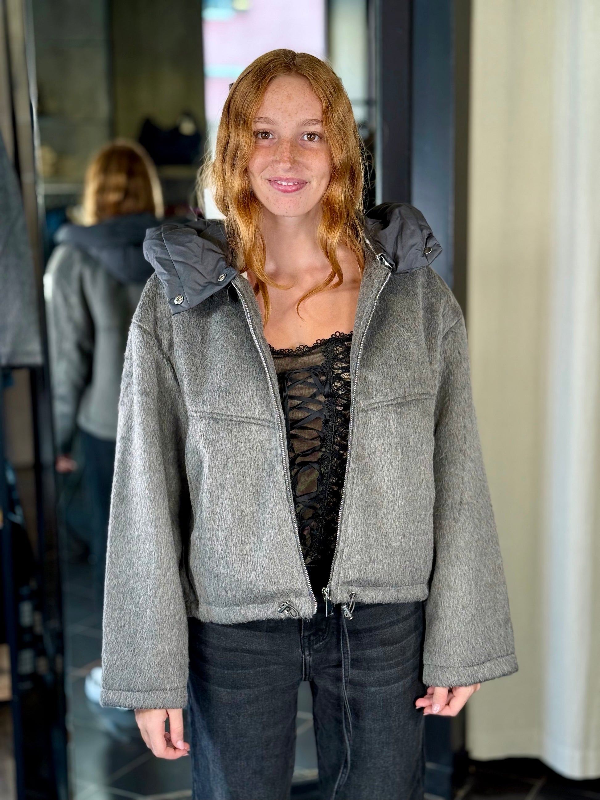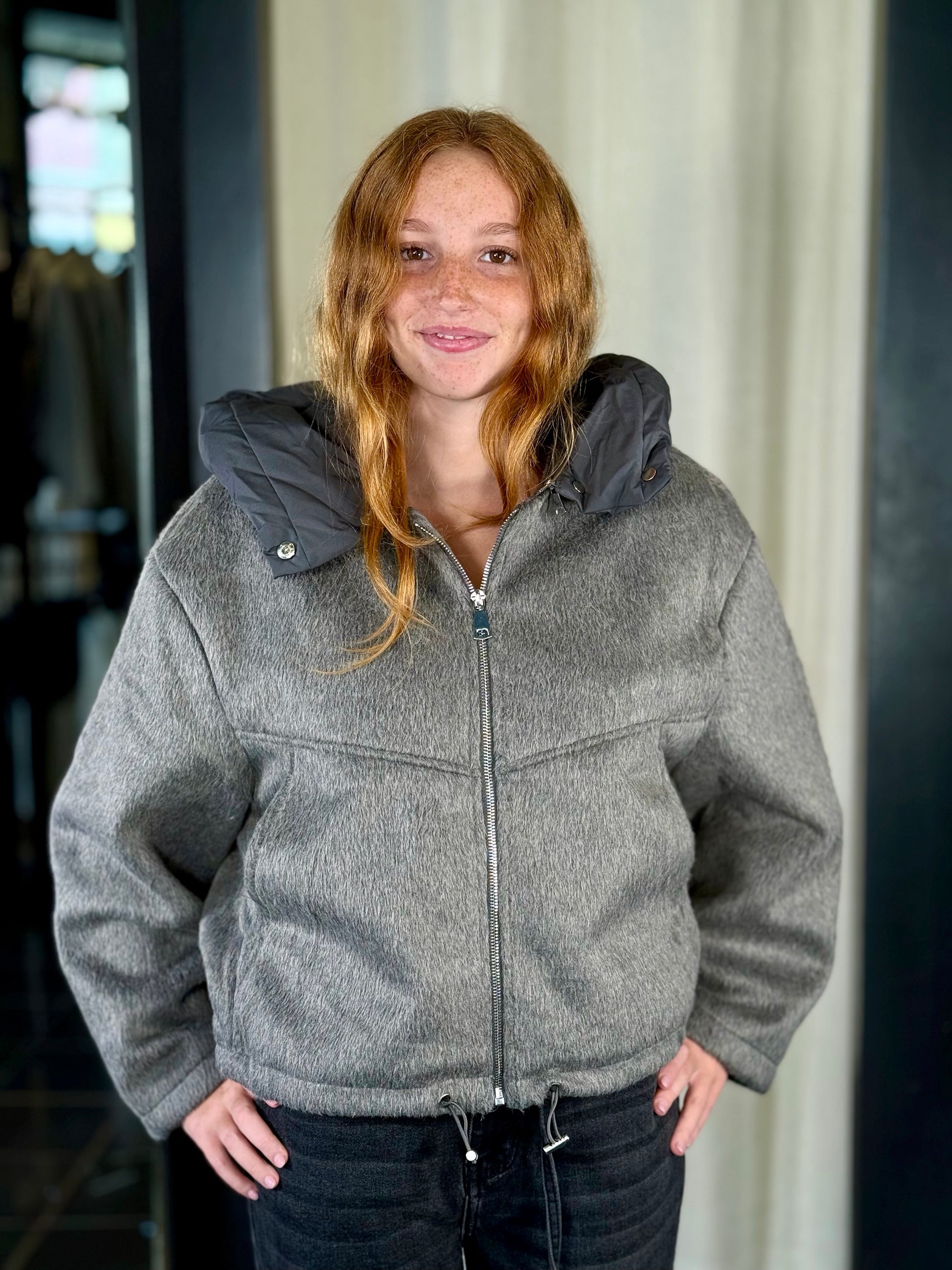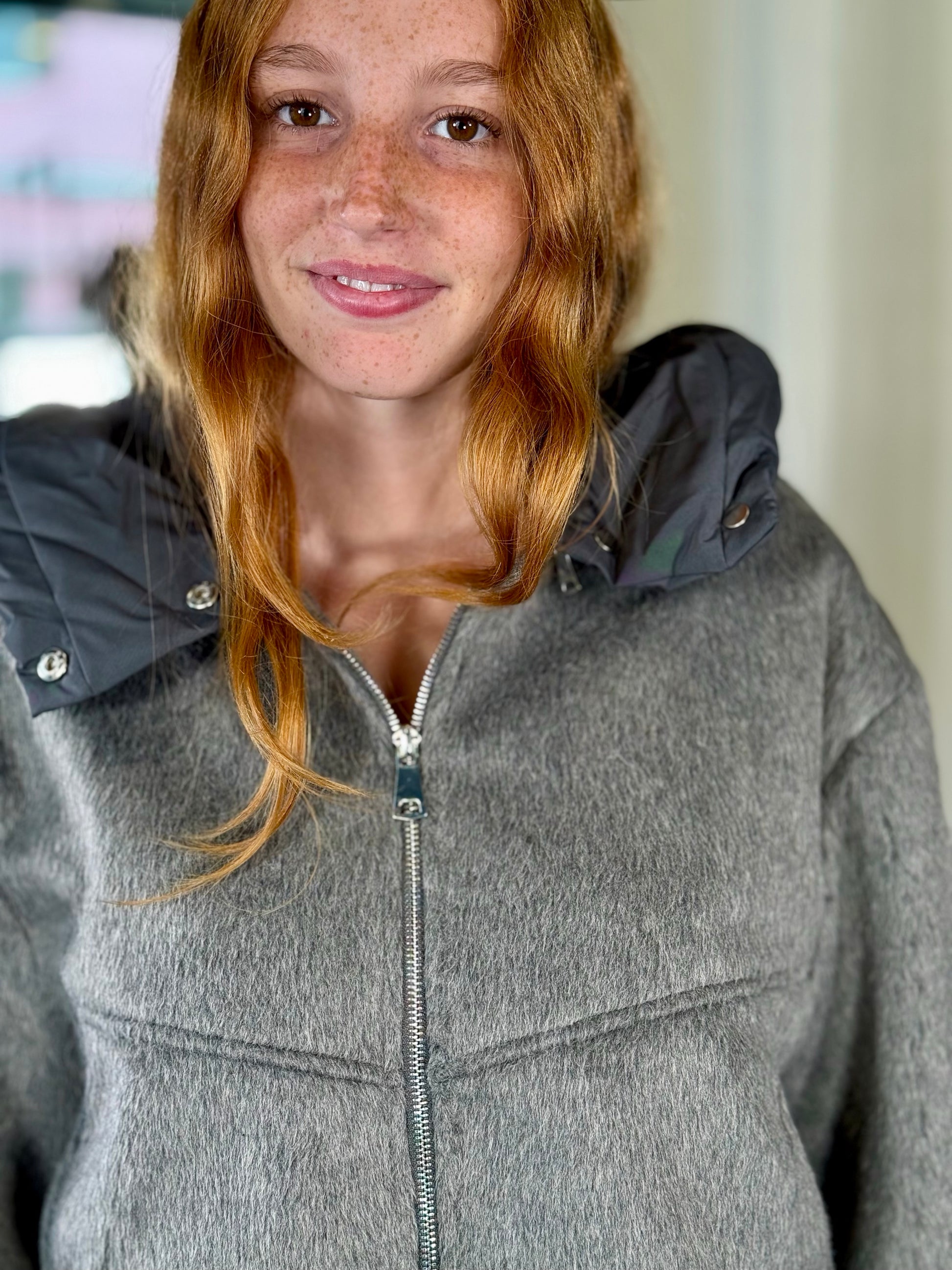 Giubbino effetto peluche grigio con cappuccio rimovibile 2211