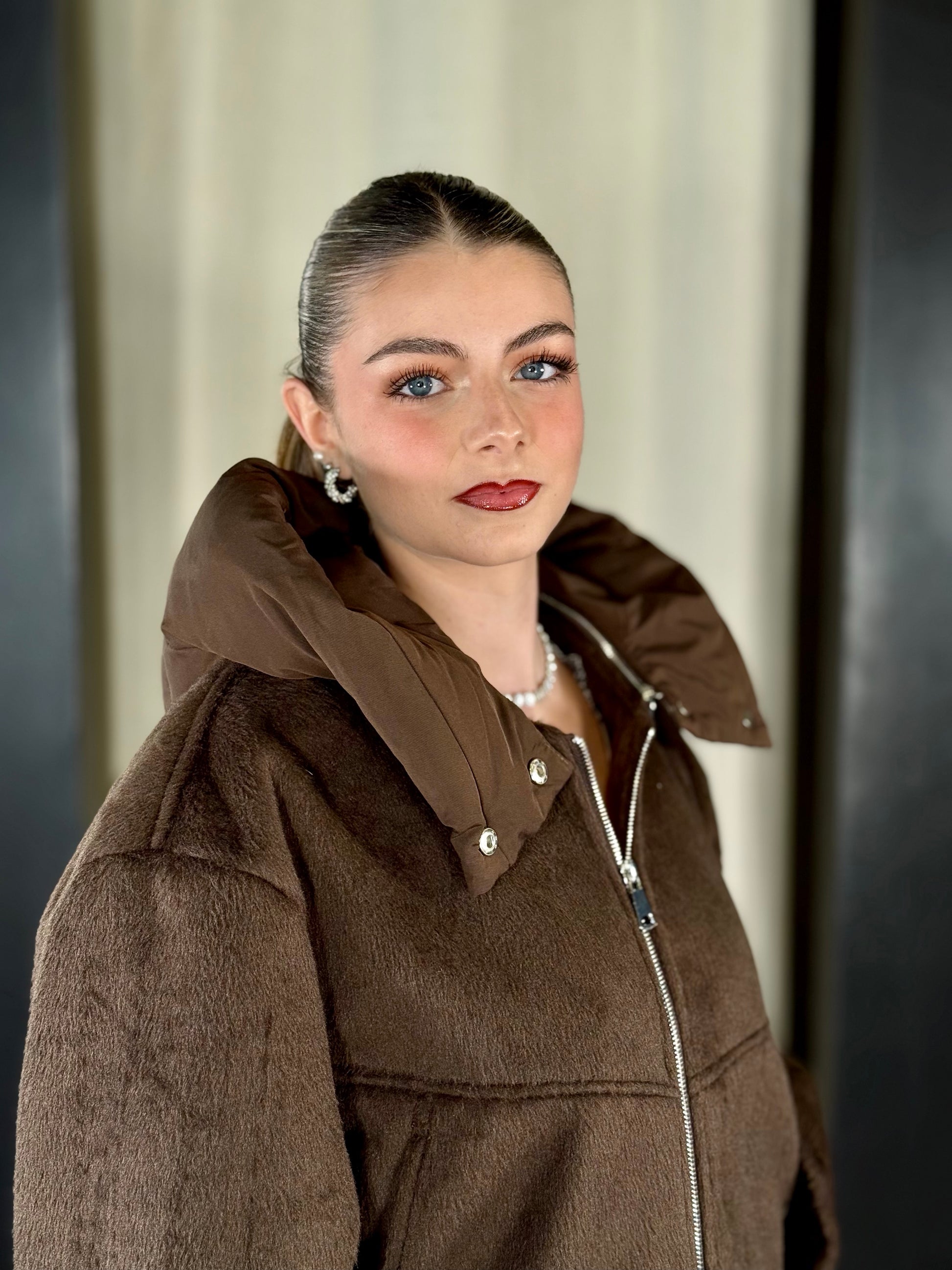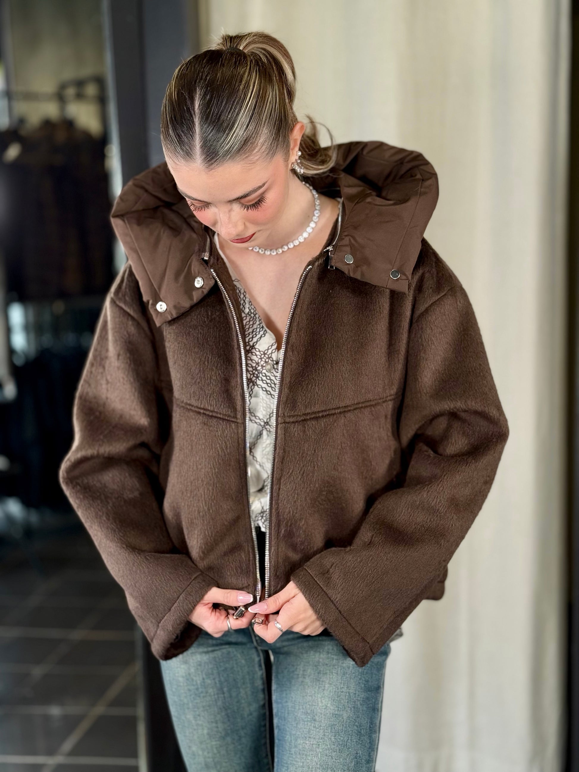 Giubbino effetto peluche marrone con cappuccio rimovibile 2183