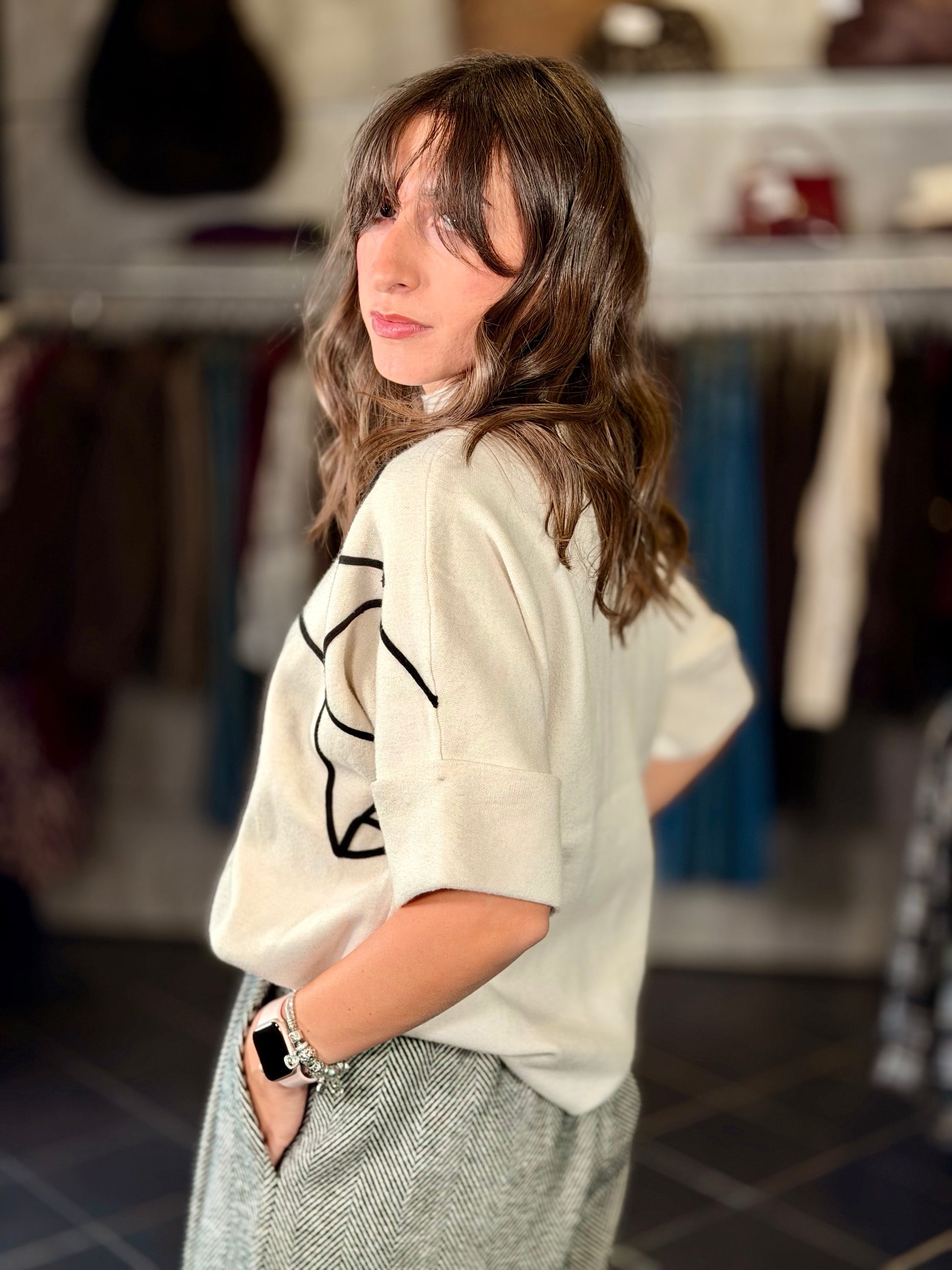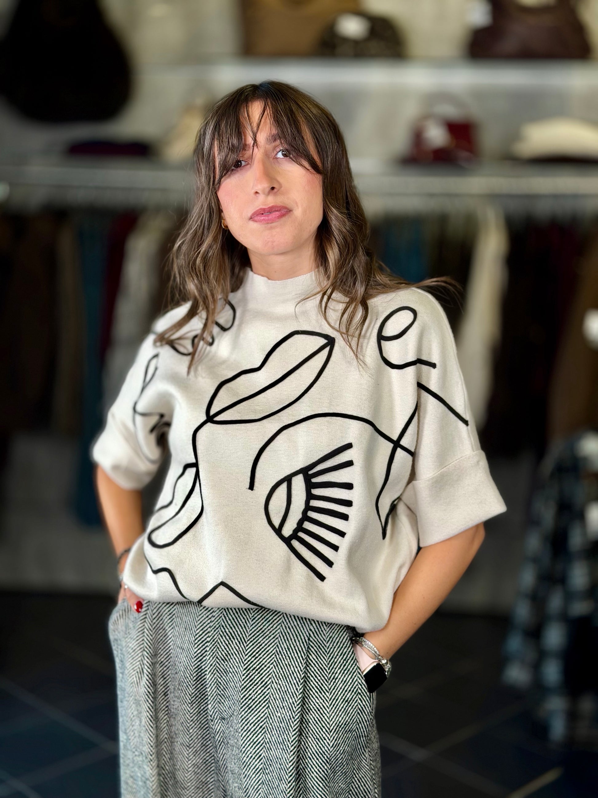 Maglioncino bianco a lupetto e maniche a tre quarti con ricamo nero in taglia unica 2216