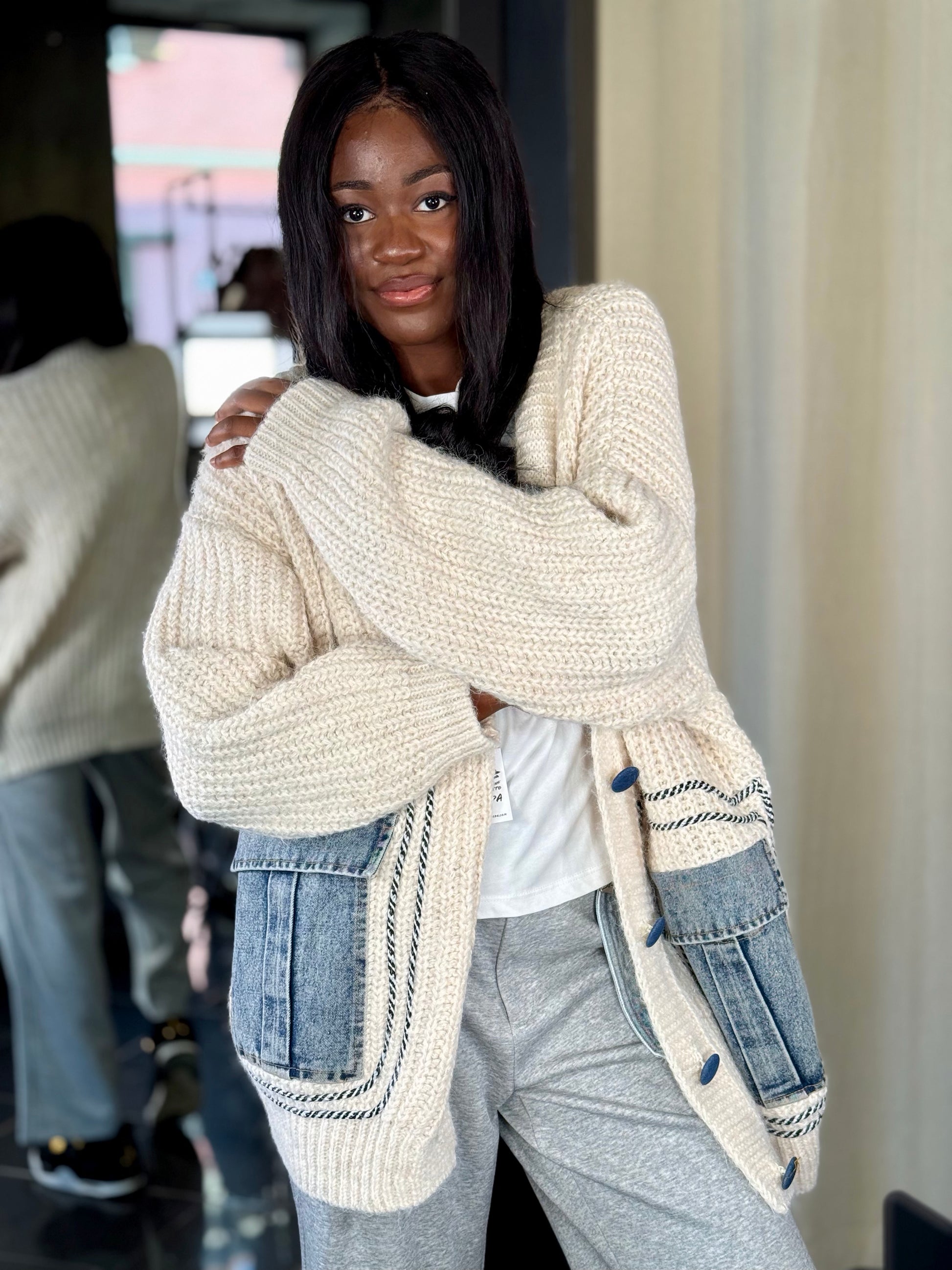 Maxi cardigan oversize panna con tasche in denim in taglia unica 2224