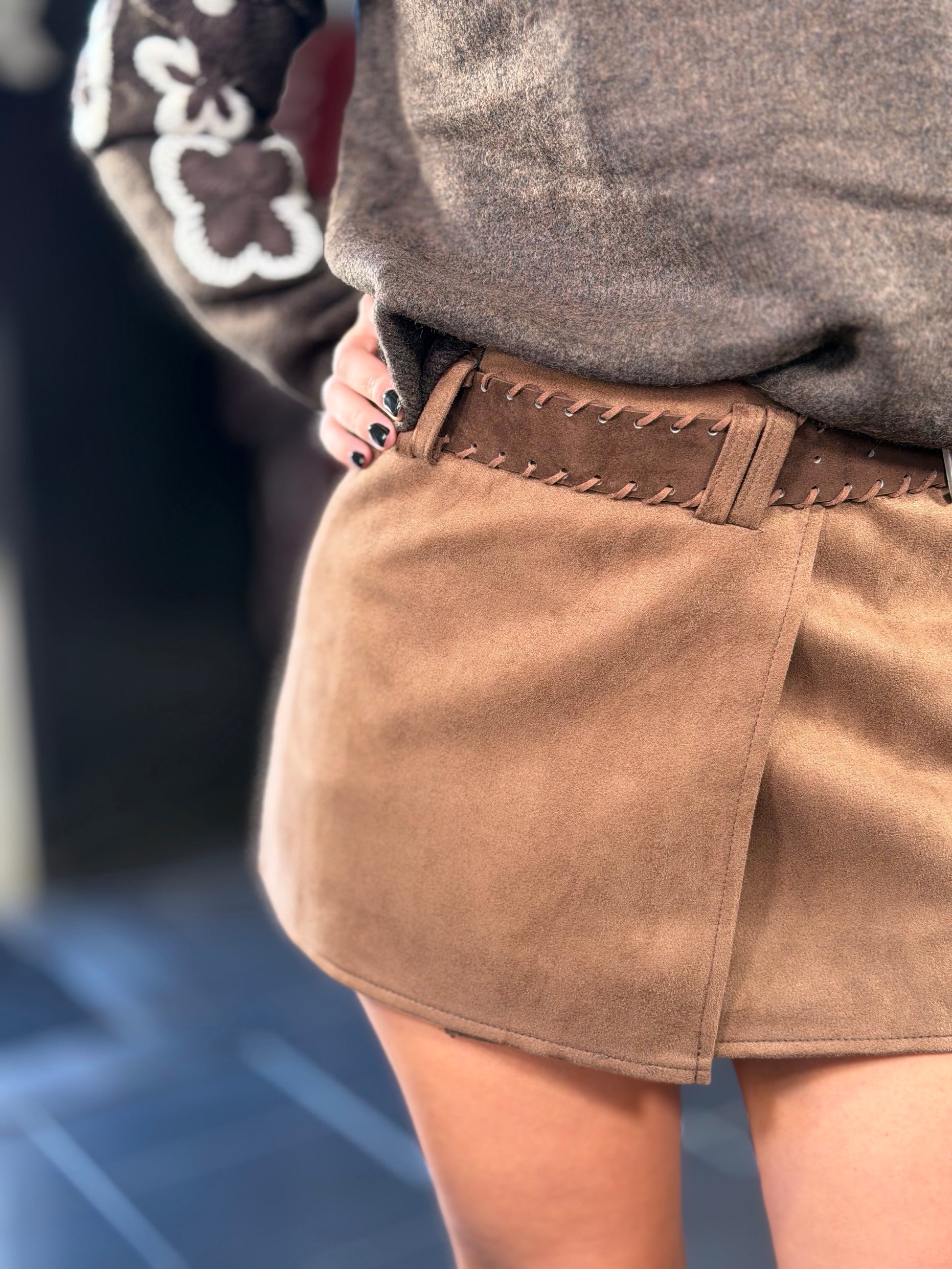 Mini gonna con pantaloncino sotto e cintura color cuoio effetto suede 2431