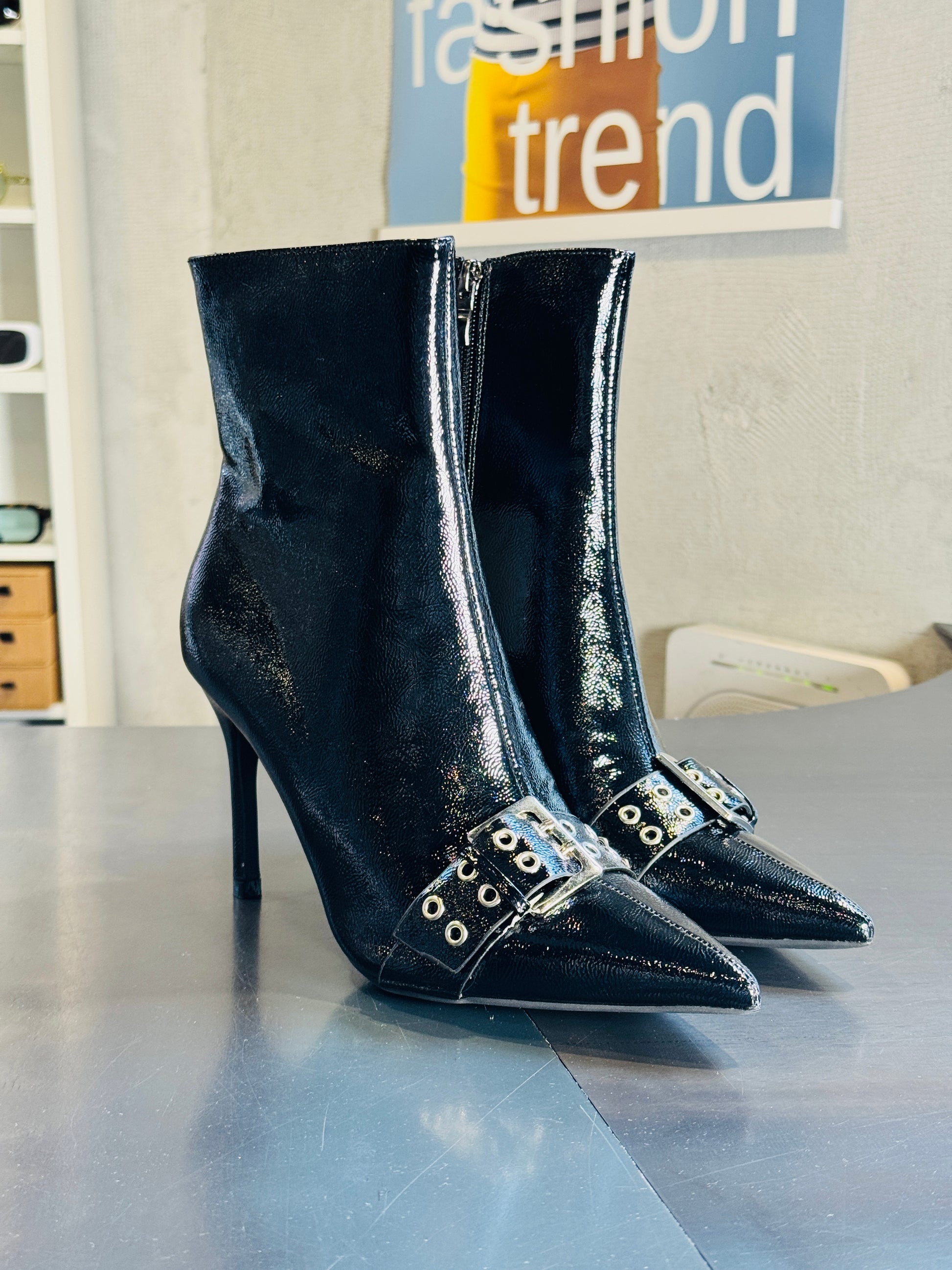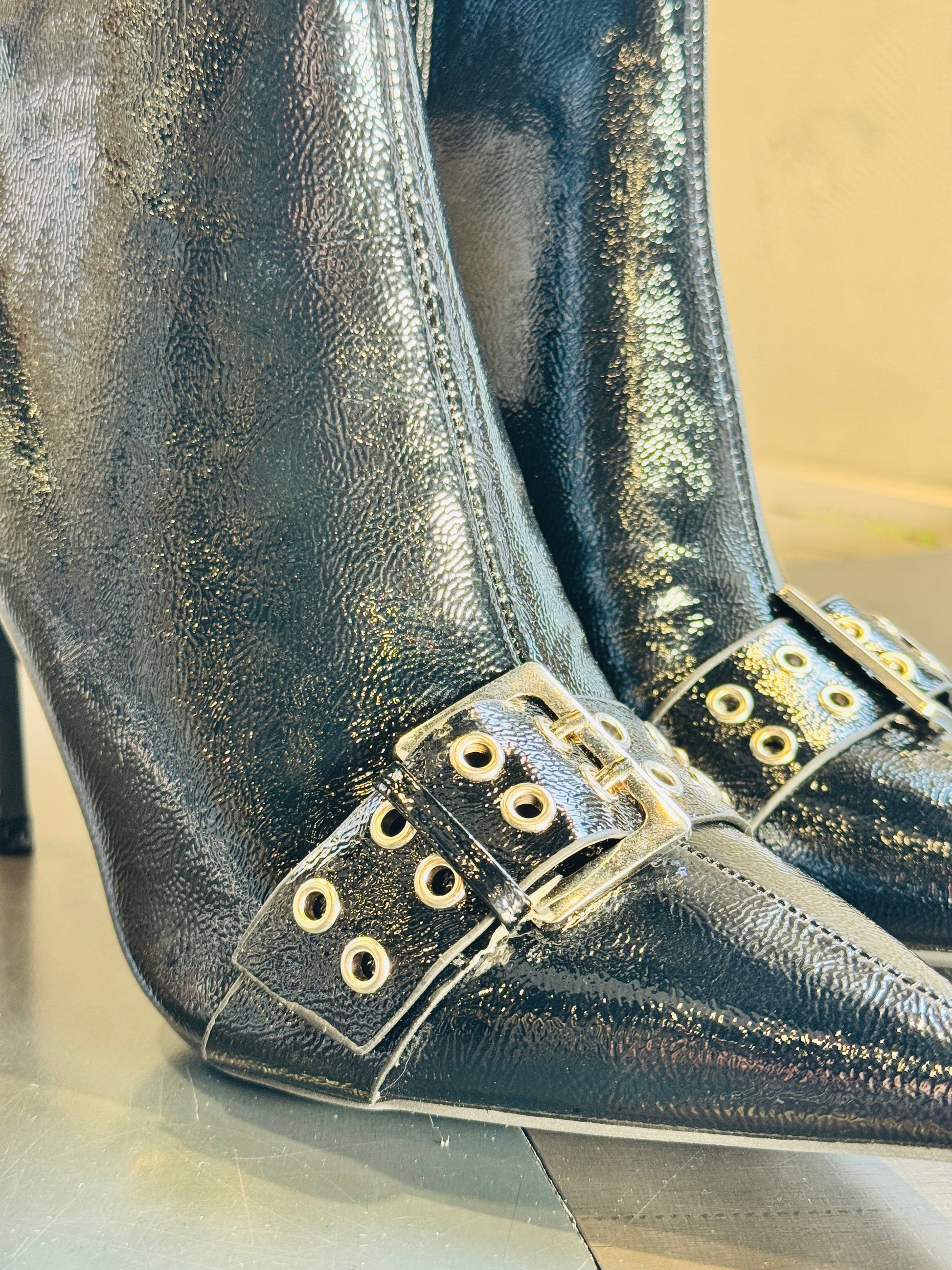 Tronchetto effetto vinile nero con fibbia borchiata 2862