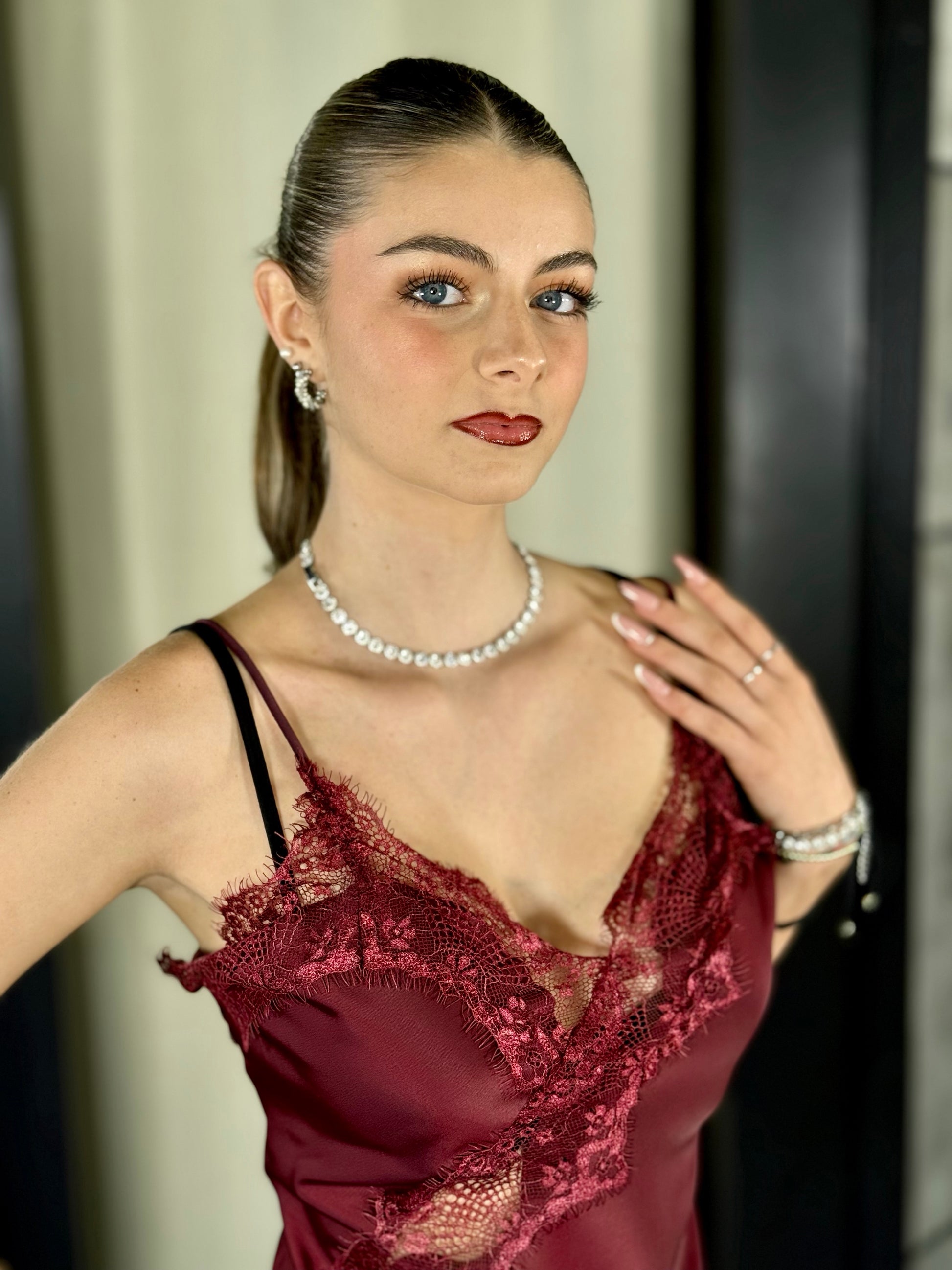 Top satinato asimmetrico con pizzo bordeaux in taglia unica 2201