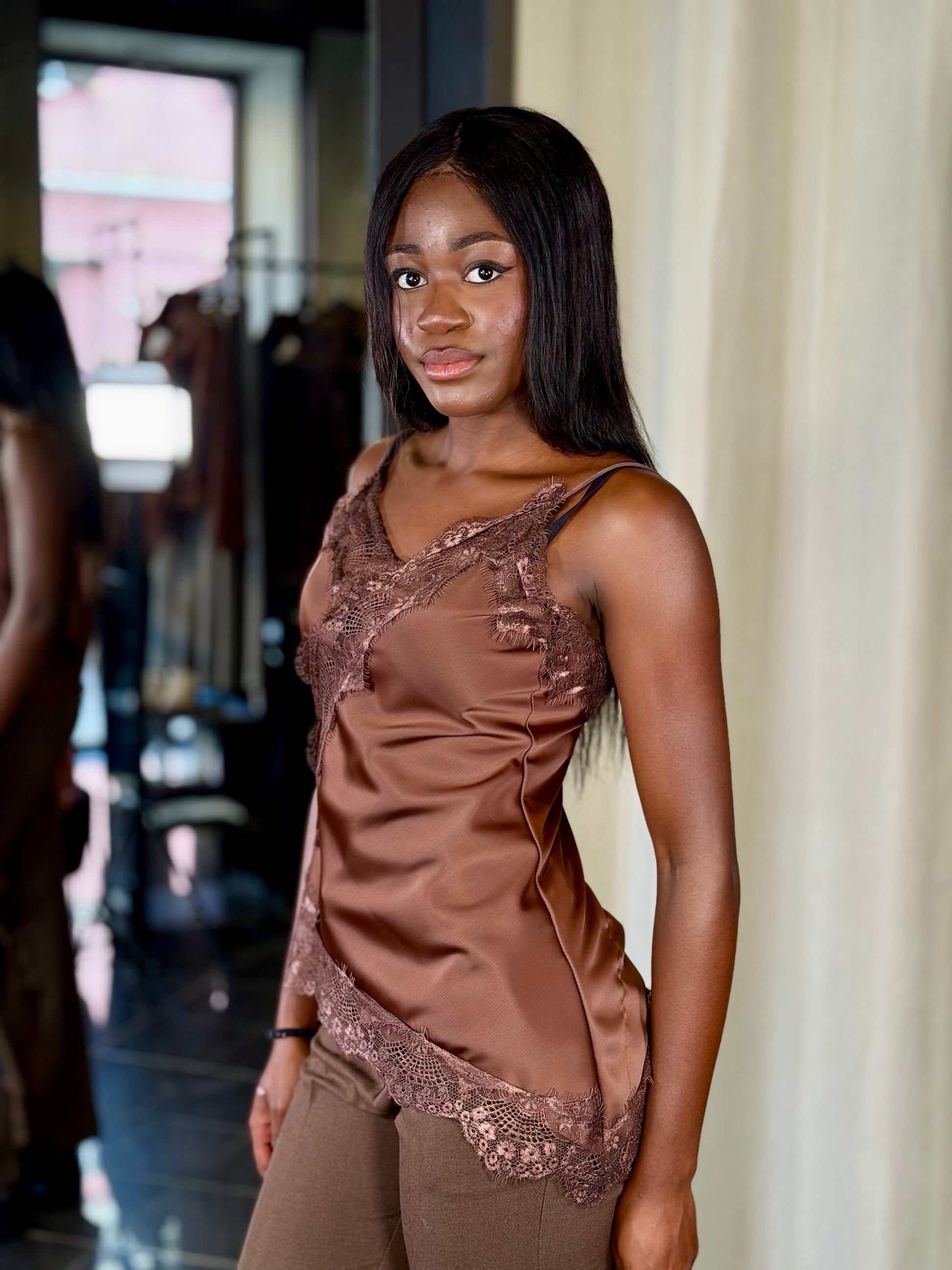 Top satinato asimmetrico con pizzo marrone in taglia unica 2240